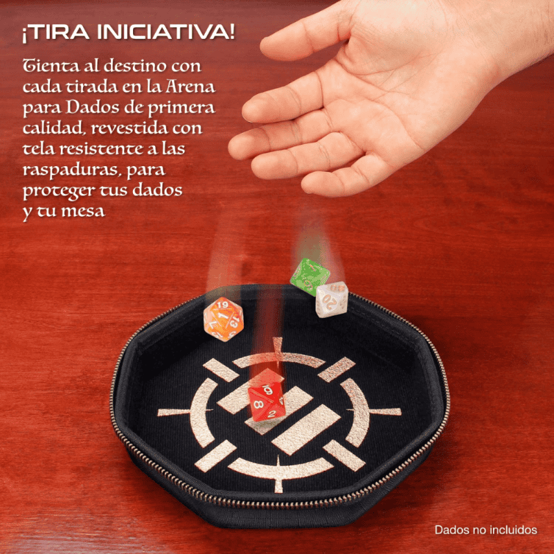 La otra mitad de la caja funciona como una gran bandeja de dados con forro suave y paredes grandes que evitan que los dados se deslicen fuera de la mesa. Lo suficientemente grande para que toda la mesa vea cada resultado.