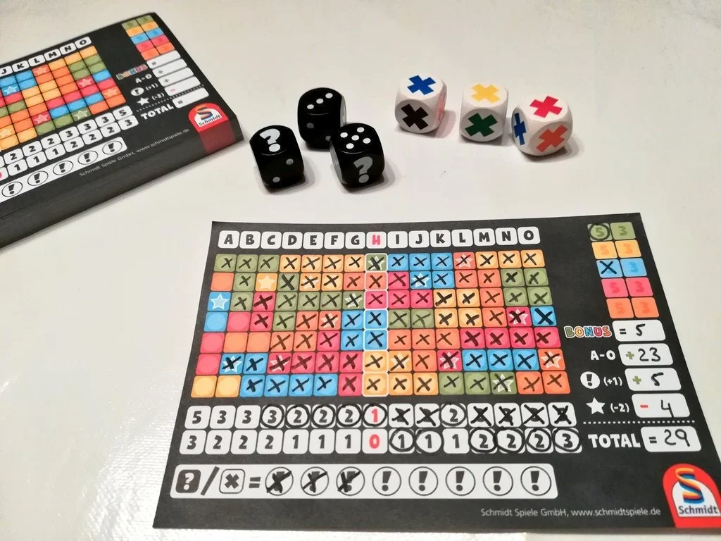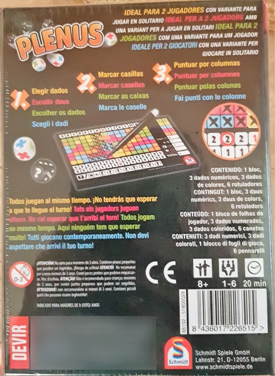 Plenus consiste en ir marcando con una cruz las casillas de color de la hoja de juego, intentando llenar lo antes posible el mayor número de columnas o de casillas del mismo color. Para ello debes combinar un dado de colores y un dado numérico, e ir marcando las casillas adyacentes del color elegido. Elegí el resultado correcto, y de paso robales a los demás jugadores las combinaciones de dados que tanto desean. Tus posibilidades irán aumentando a medida que te vayas extendiendo por la hoja de juego. Además de ganar puntos por las columnas individuales, podrás obtener un bonificador si completas todas las casillas de un mismo color. La partida termina cuando un jugador marca todas las casillas de dos colores distintos. Llegados a este punto… ¡siempre podés jugar otra partida!